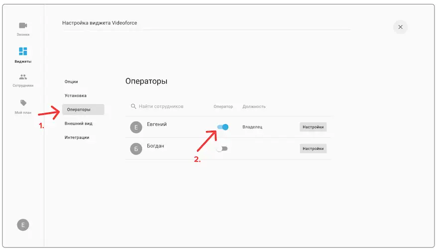 3. Назначьте операторов на виджет. Добавить коллег можно в разделе "сотрудники" в левой панели:
