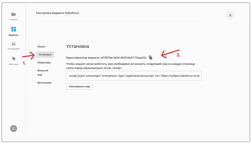 На экране настройки интеграции, в строке ID виджета VideoForce вставьте ID, скопированный ранее в их личном кабинете: