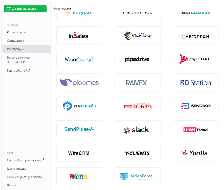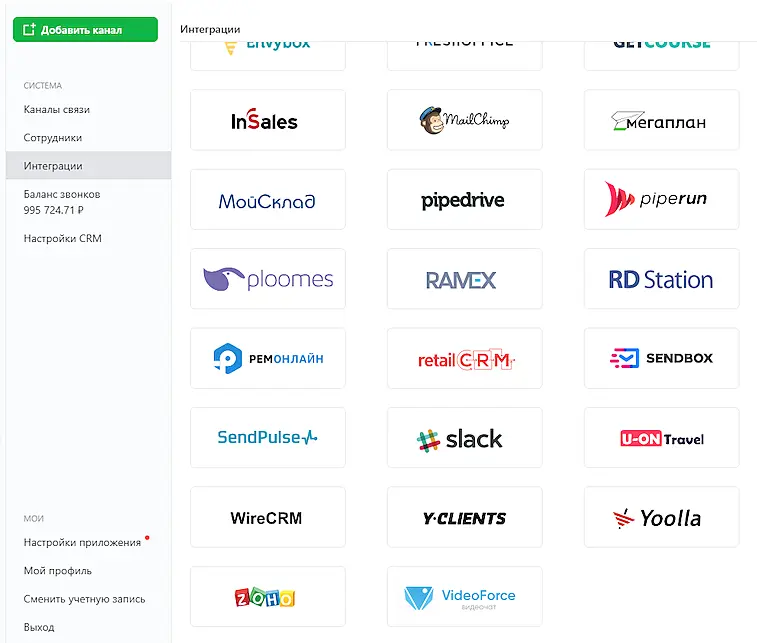 Далее перейдите в приложение Jivo -> раздел Управление -> Интеграции и выберите в списке VideoForce, нажмите на него, чтобы подключить.