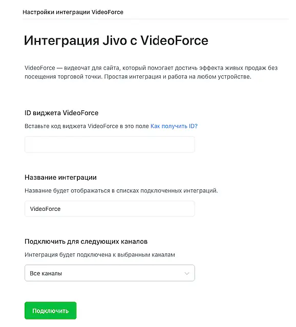 Интеграция с сервисом VideoForce позволяет подключить виджет для видеозвонков прямо из личного кабинета Jivo, без необходимости устанавливать дополнителный скрипт на сайт.