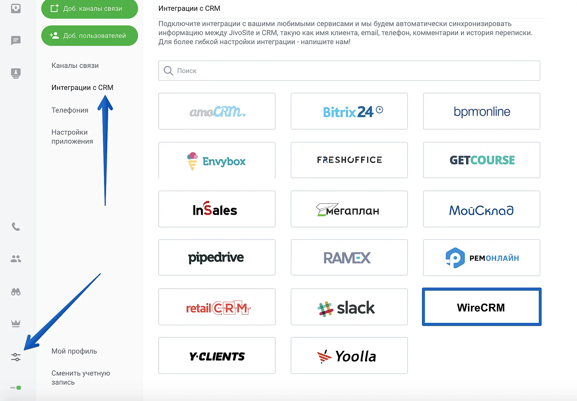 Для подключения интеграции с WireCRM зайдите в приложение Jivo > "Управление" > "Интеграции CRM" и выберите WireCRM.