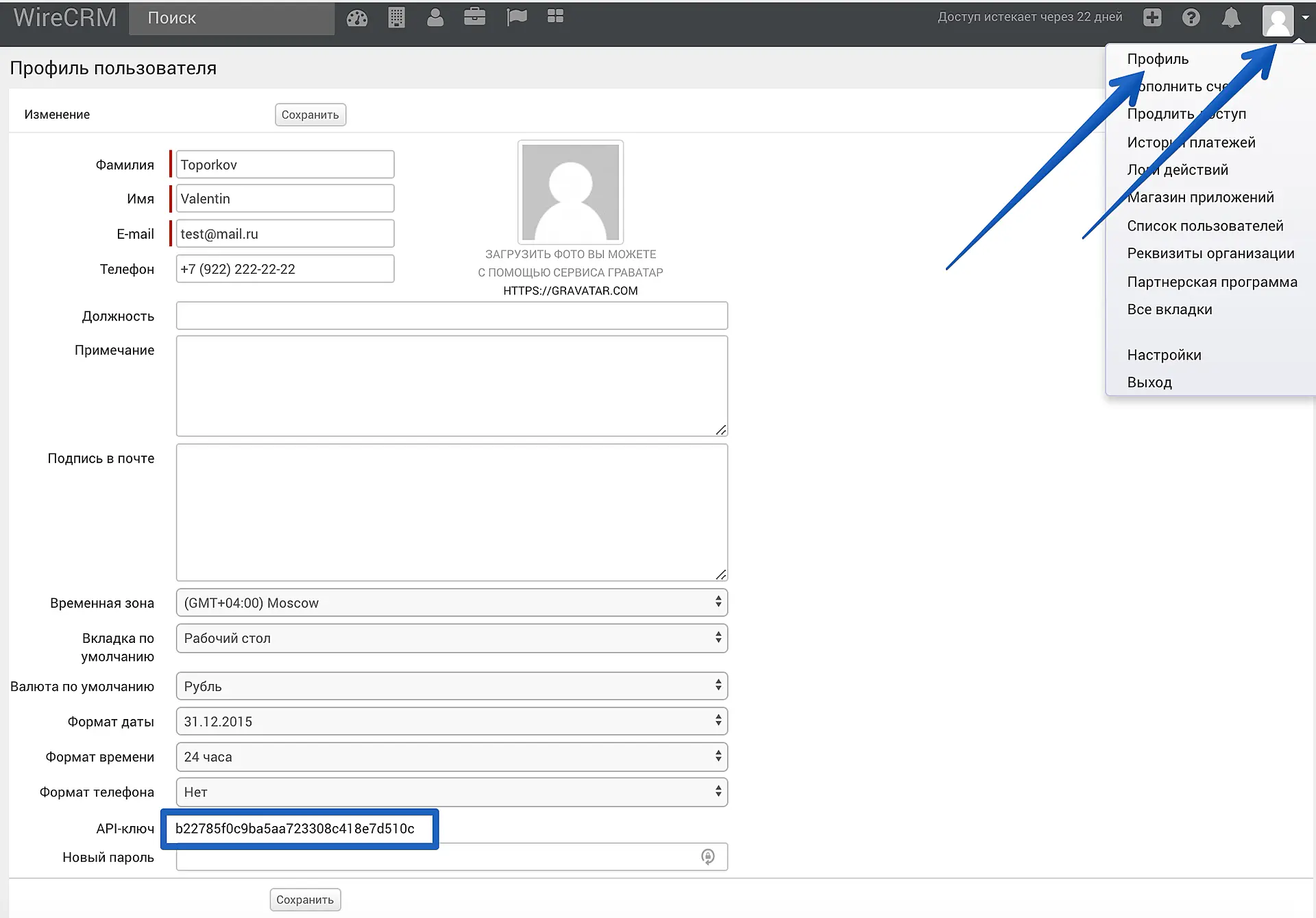 1. Ключ API Найти его можно в настройках вашего профиля WireCRM. Нажмите на вашу иконку в правом верхнем углу, перейдите в "Профиль", скопируйте ваш ключ и поместите в это поле.