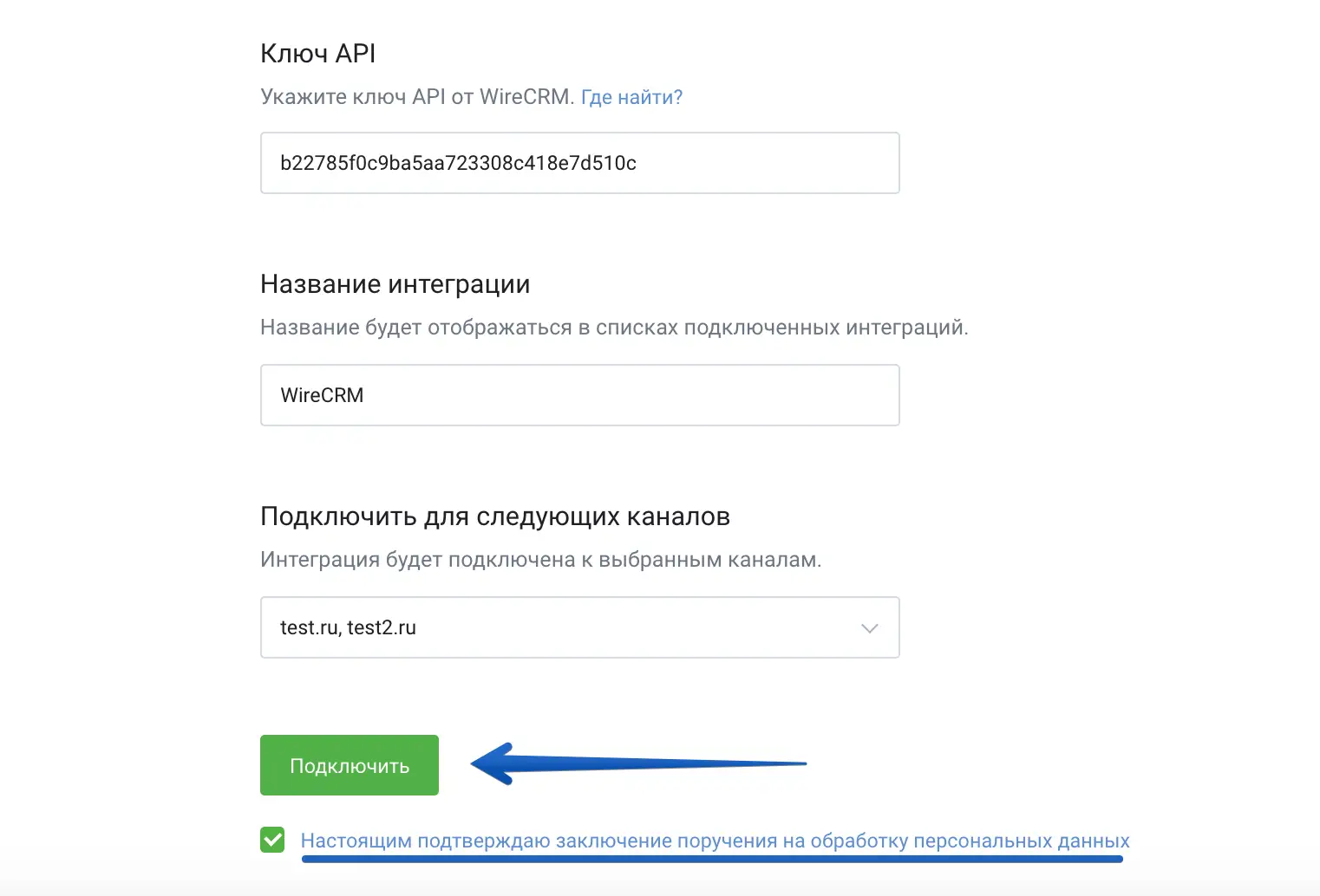 В открывшейся форме подключения интеграции нужно будет заполнить следующие поля: