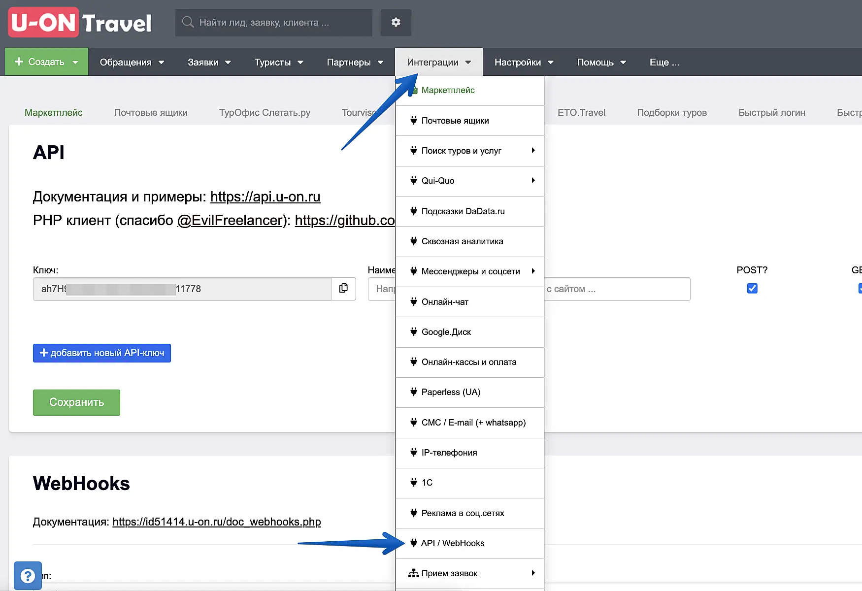Для подключения откройте вашу систему в U-ON.Travel и перейдите в раздел "Интеграция" > "API / WebHooks".