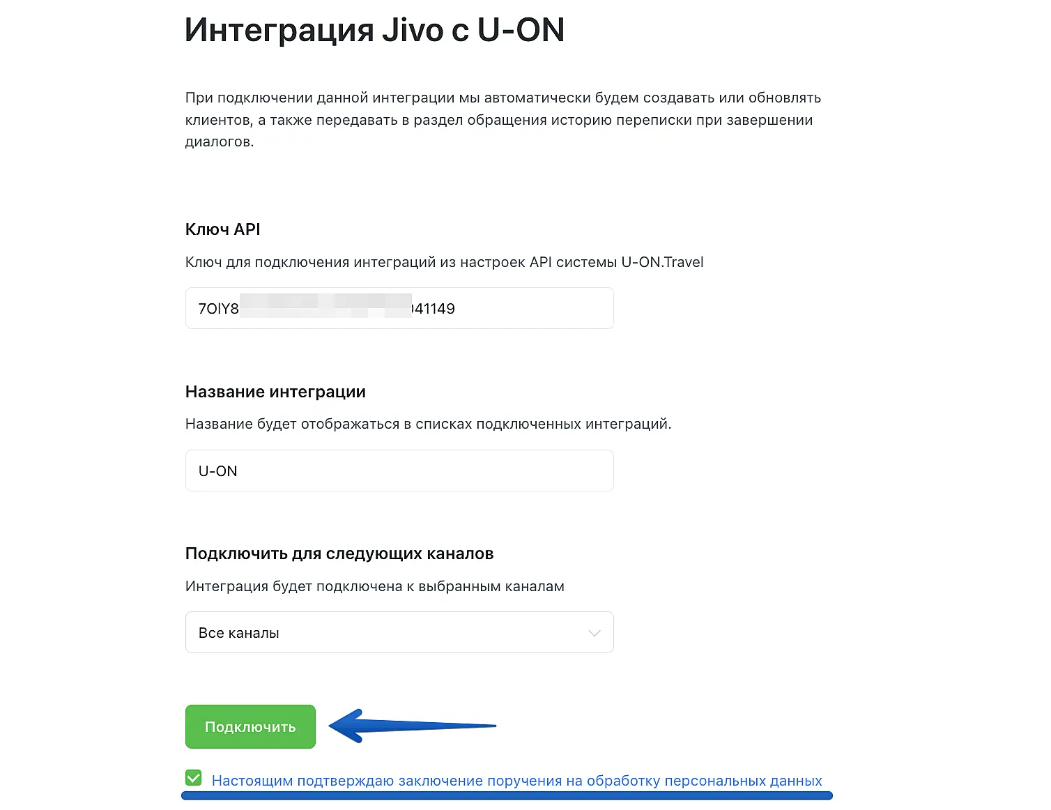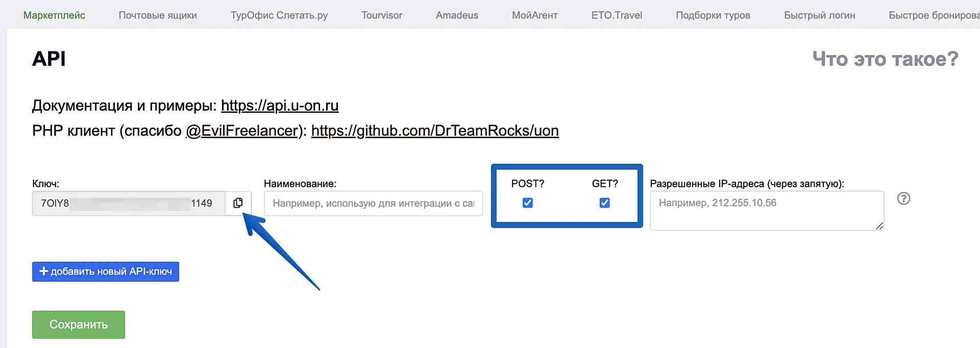Вставьте скопированный в кабинете U-ON.Travel ключ в поле "Ключ API".