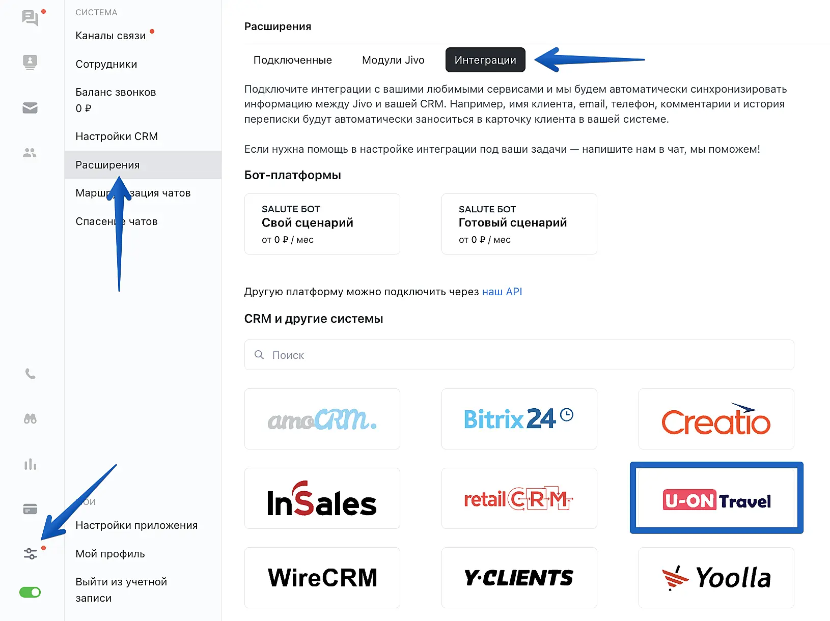 Затем откройте приложение Jivo, перейдите в "Управление" > "Расширения" > "Интеграции" и выберите "U-ON.Travel".