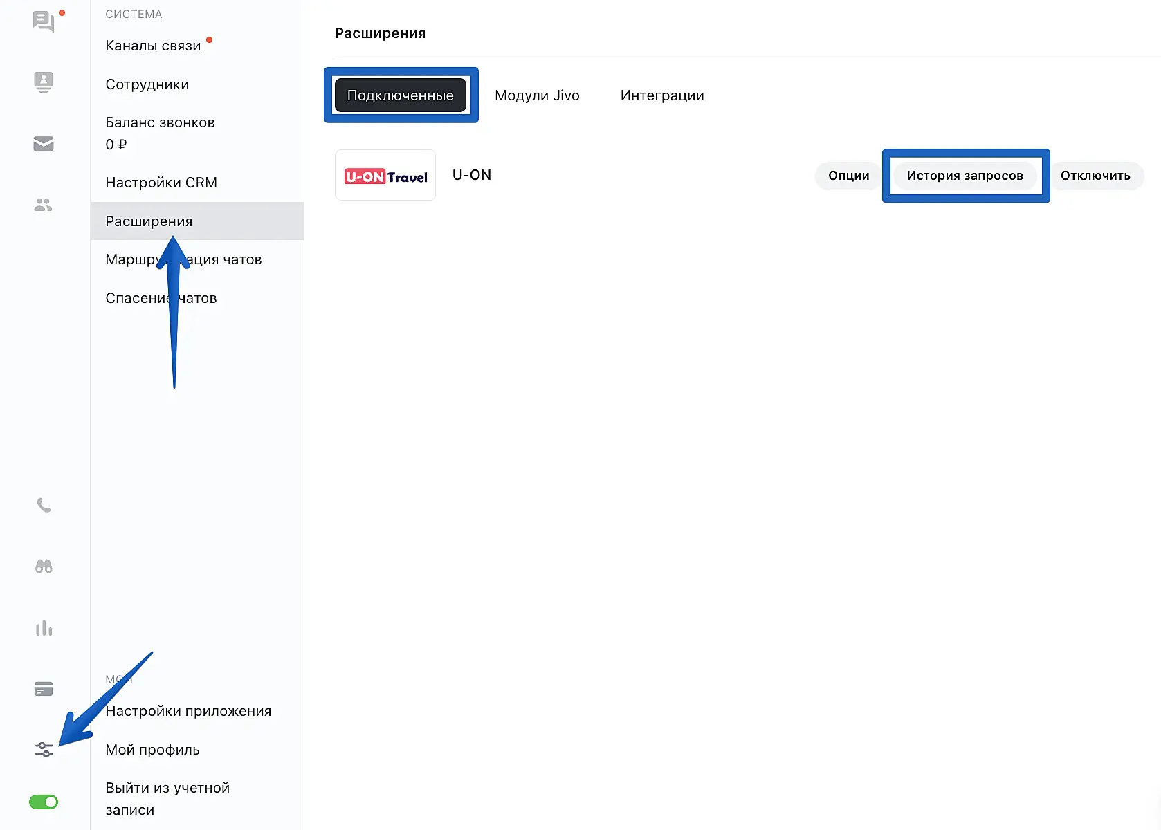 Перейдите в "Управление" > "Расширения" > "Подключенные" и нажмите "История запросов" напротив "U-ON".