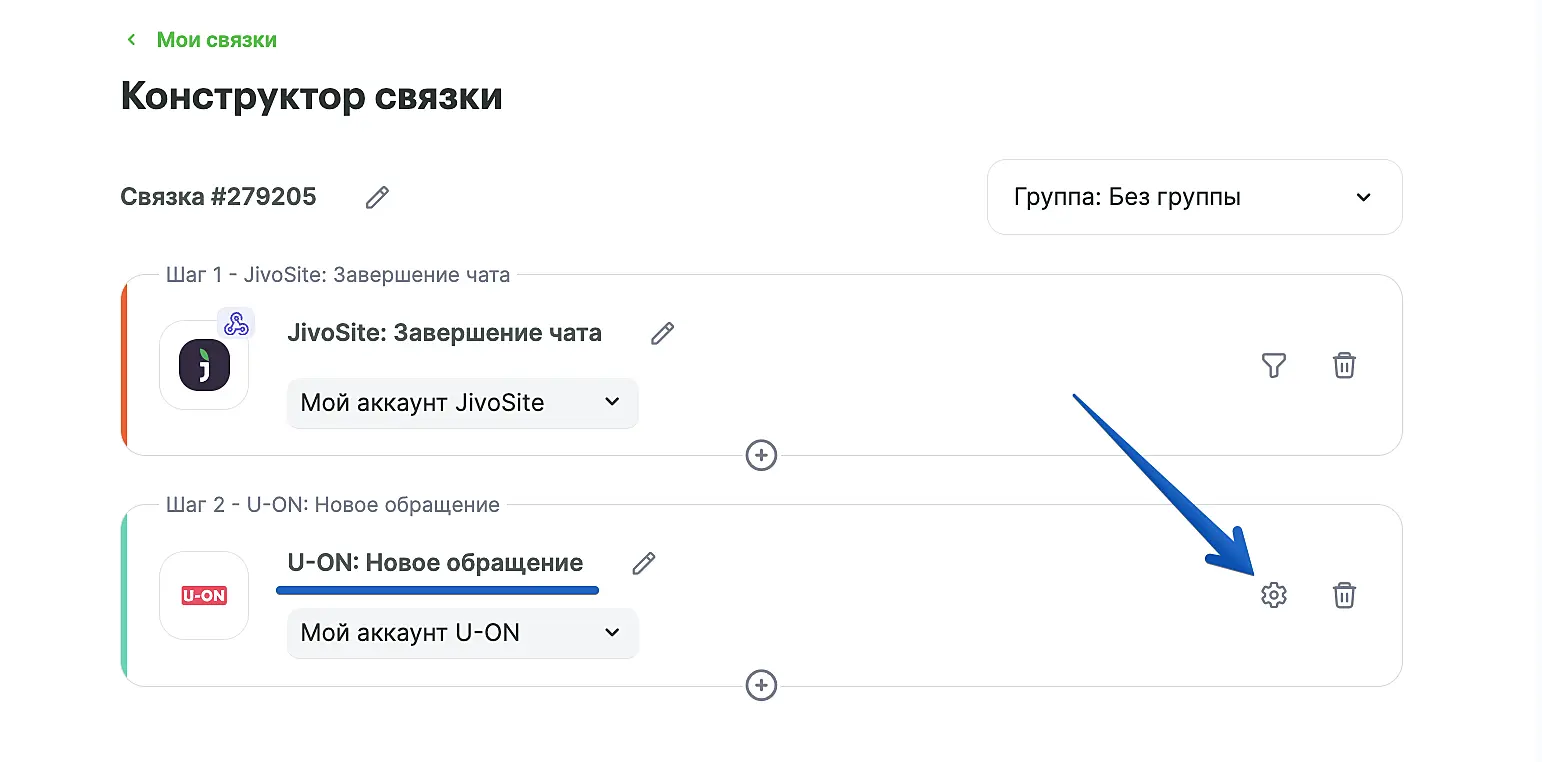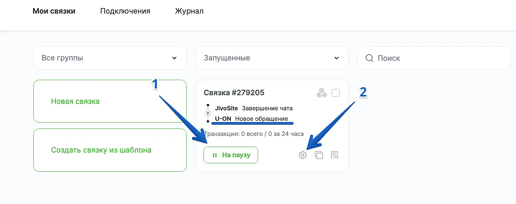 Приостановите связку "U-ON Новое обращение" и перейдите в ее настройки, нажав на шестеренку.