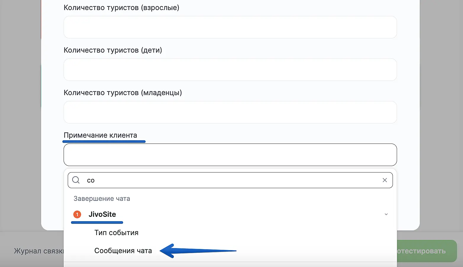 Найдите в списке поле "Примечание клиента". Нажмите на него и выберите "JivoSite: Сообщения чата".