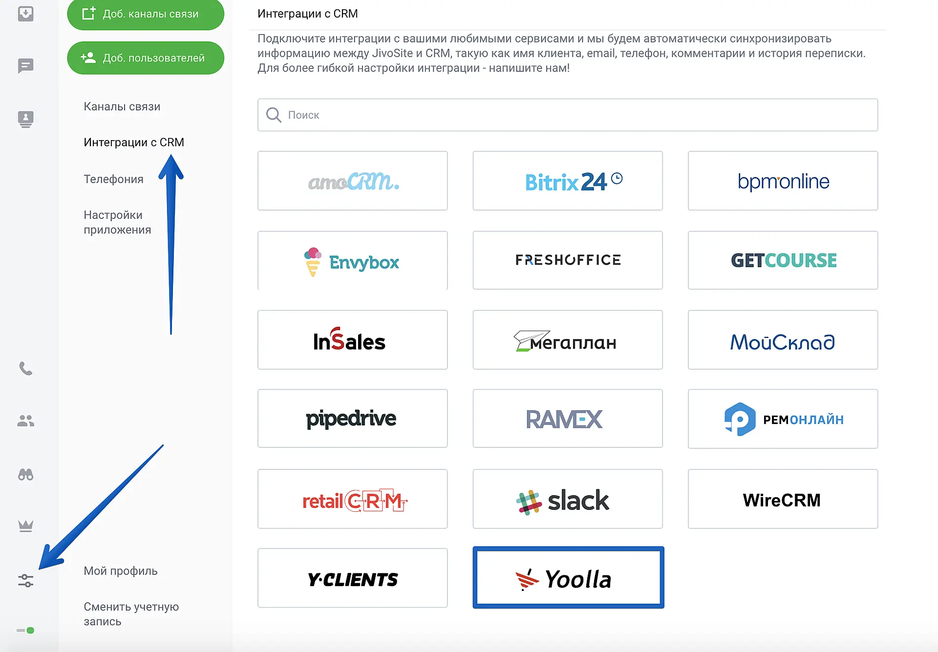 Для подключения интеграции с Yoolla зайдите в приложение Jivo > "Управление" > "Интеграции CRM" и выберите Yoolla.