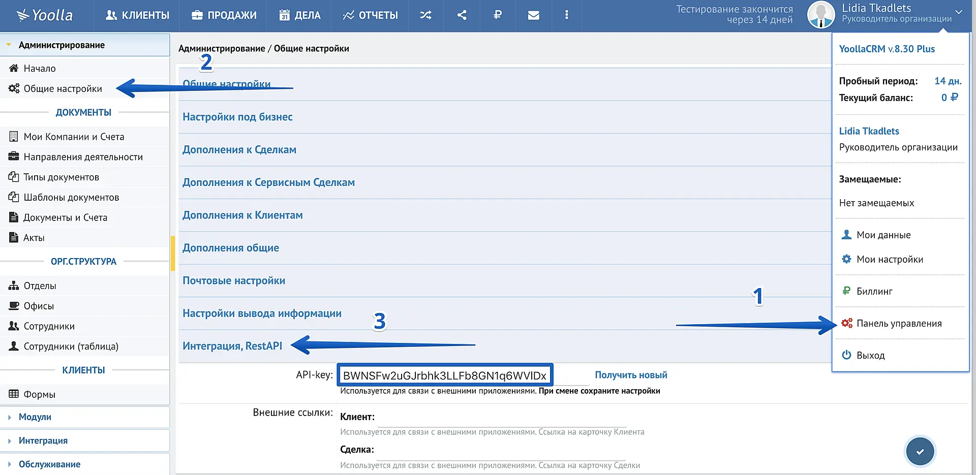 2. Токен API. Для получения нажмите на вашу иконку в правом верхнем углу и перейдите в "Панель управления". Откройте "Общие настройки" в разделе администрирования и затем перейдите в "Интеграция, RestAPI". Скопируйте ваш API-key и поместите в данное поле.
