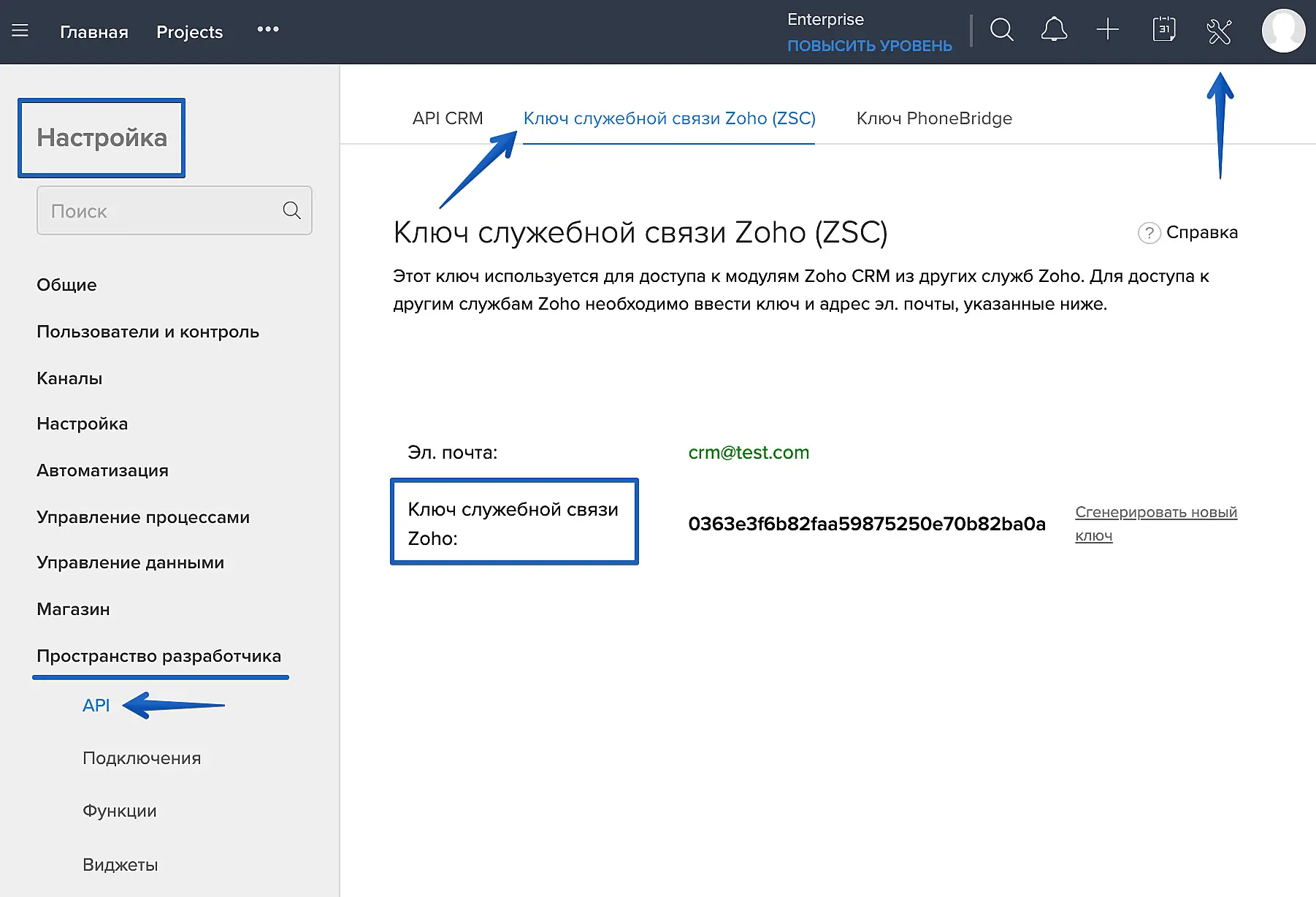 1. Ключ API. Чтобы создать токен, перейдите в панель управления Zoho, откройте меню Настройка -> Пространство разработчика -> API и перейдите на вкладку "Ключ служебной связи Zoho". В этом разделе нужно сгенерировать ключ, а затем скопировать его: