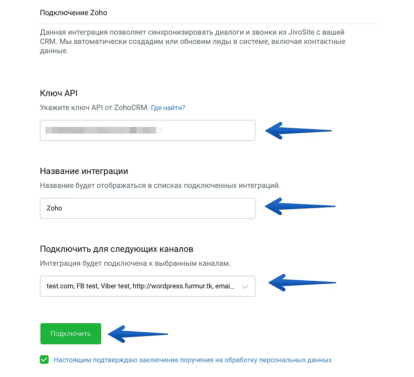 Готово! Интеграция подключена, теперь данные из JivoChat будут добавляться в вашу CRM Zoho.
