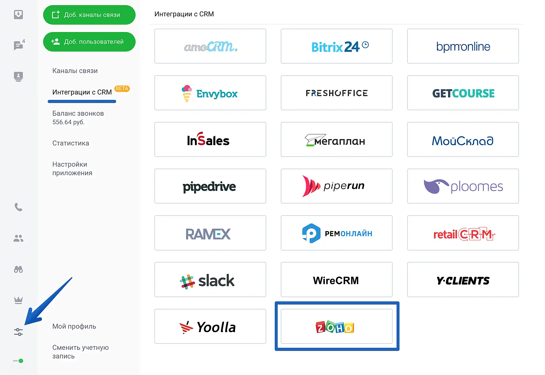Для подключения интеграции откройте приложение Jivo, перейдите в Управление > Интеграции с CRM и нажмите на Zoho.