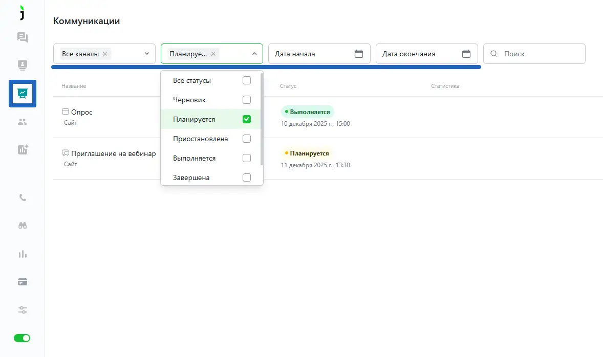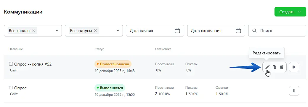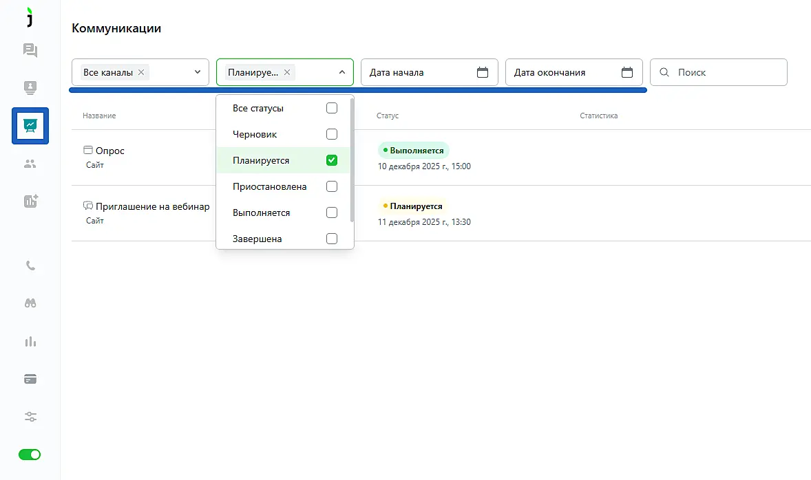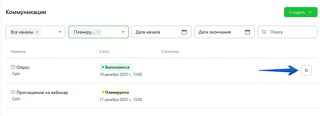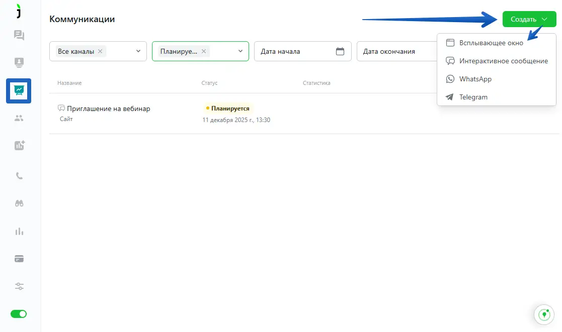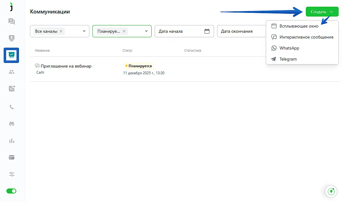 В этом же разделе вы можете отфильтровать поп-апы и интерактивные сообщения по каналу связи, статусу или дате.