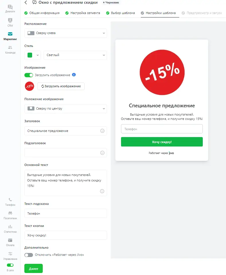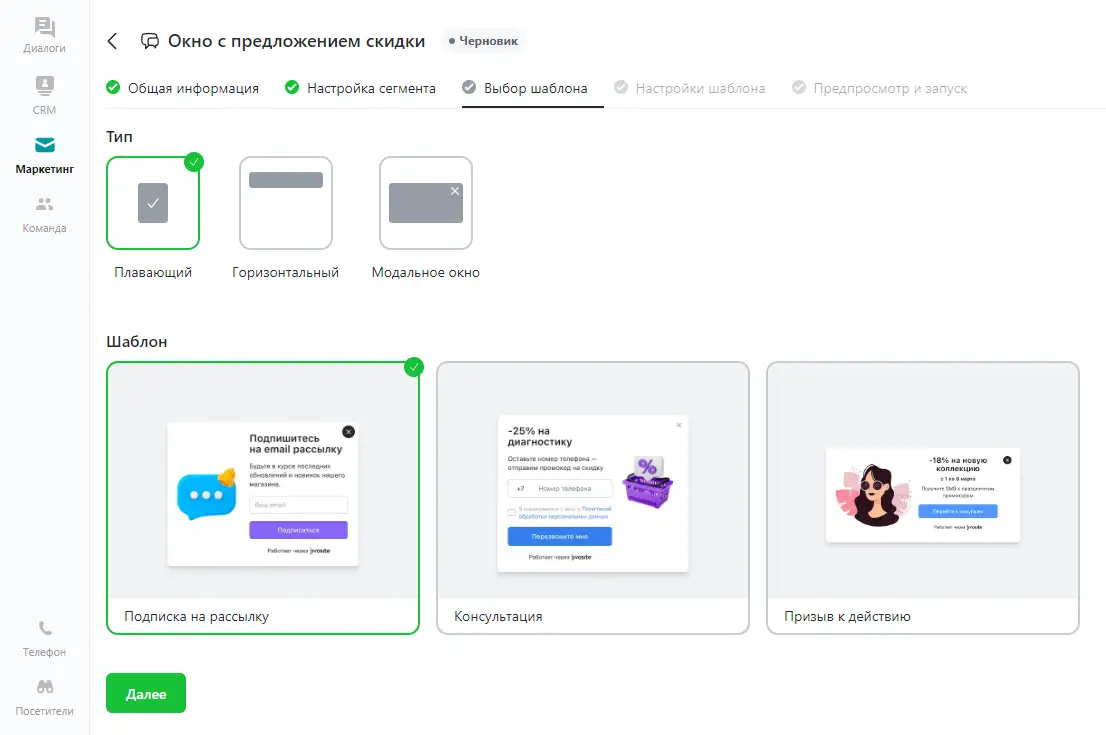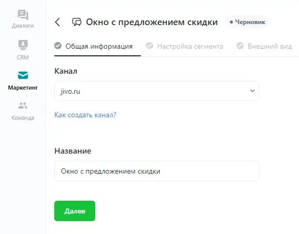 В приложении Jivo откройте раздел Маркетинг, нажмите кнопку Создать и выберите пункт "Всплывающее окно". Выберите канал для применения окна и укажите название.