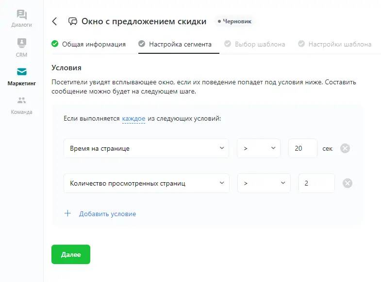 Сформируйте сегмент пользователей, которым вы хотите показывать всплывающее окно. Прочитать о них подробнее и узнать принципы их срабатывания вы можете в Справочнике по настройке сегмента.