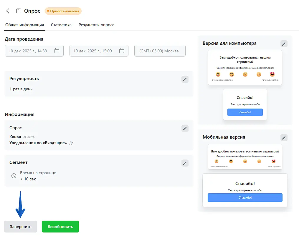 7 - Для типа "Опрос": укажите текст низкой и высокой оценок. Выберите и укажите "Дополнительный вопрос", при необходимости.