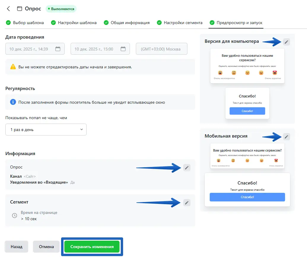 Вы сможете изменить настройки всплывающего окна, если оно находится в статусах: "Черновик", "Планируется", "Выполняется", "Приостановлена".