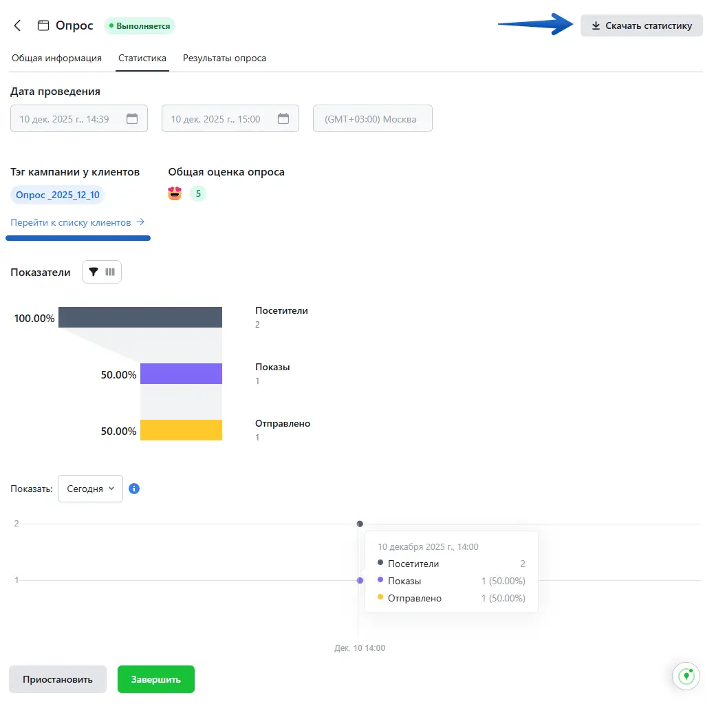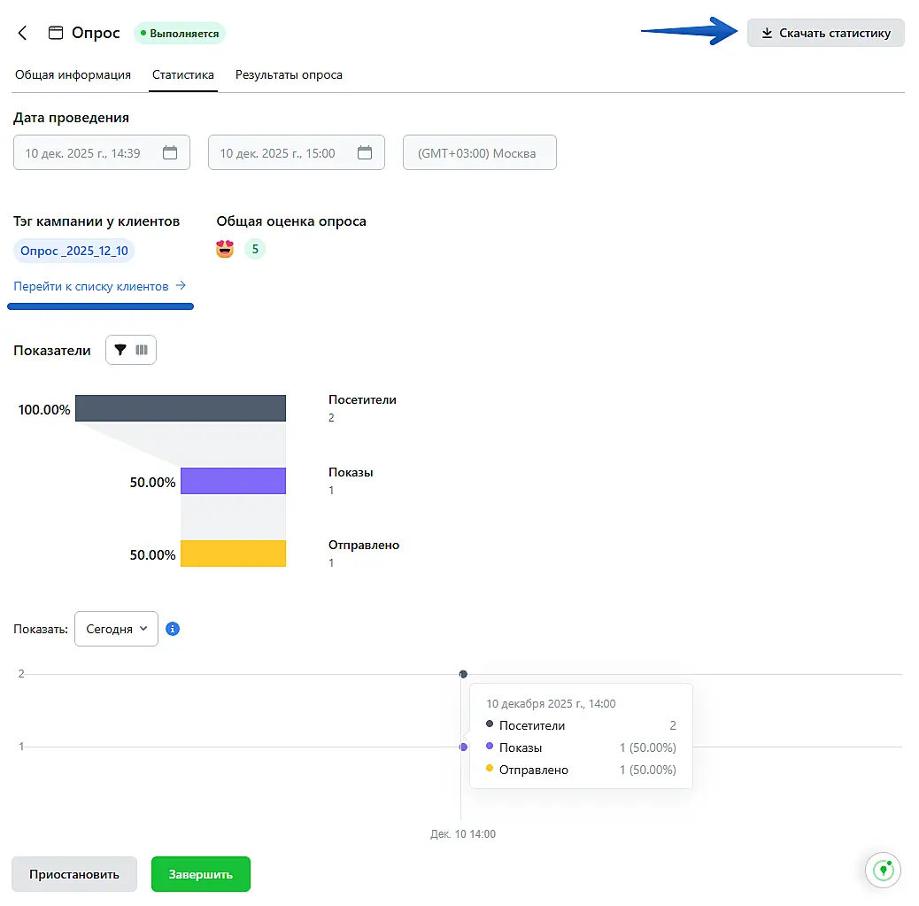 Для поп-апов с типом "Опрос" вы можете скачать документ с оценками пользователей, нажав на соответствующую кнопку в правом верхнем углу. Доступно скачивание в формате "Excel" и "CSV", ссылка придет во всплывающем окне в этом же разделе.