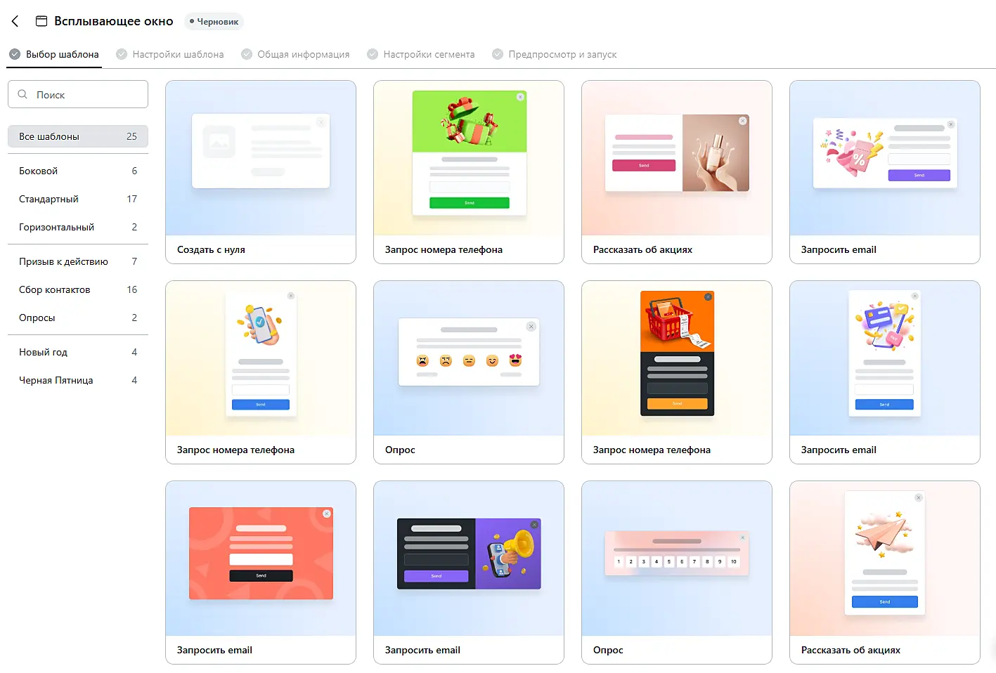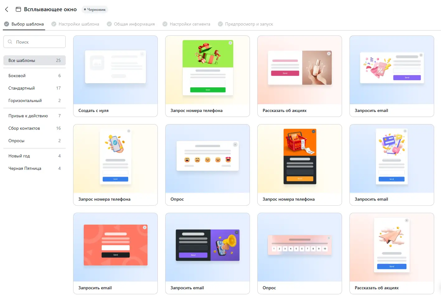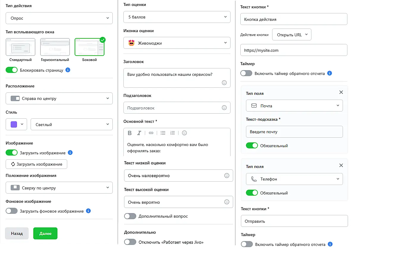 Для типа "Сбор контактов": выберите, какие именно данные клиента вы хотите запросить в поп-апе.