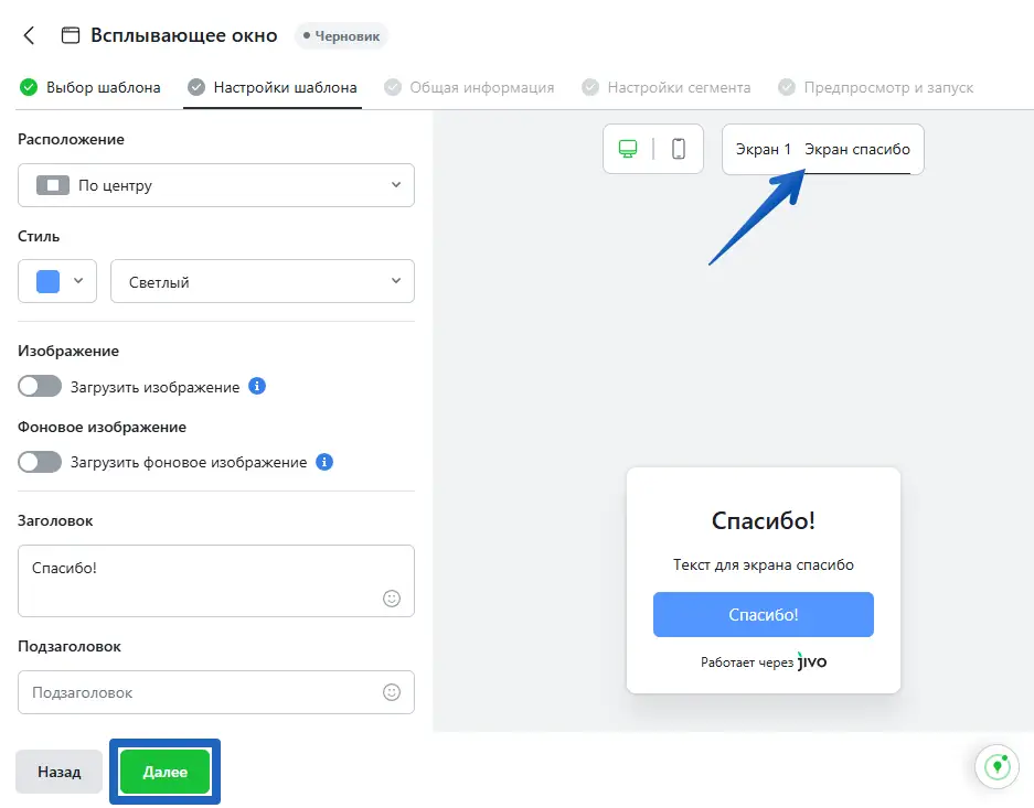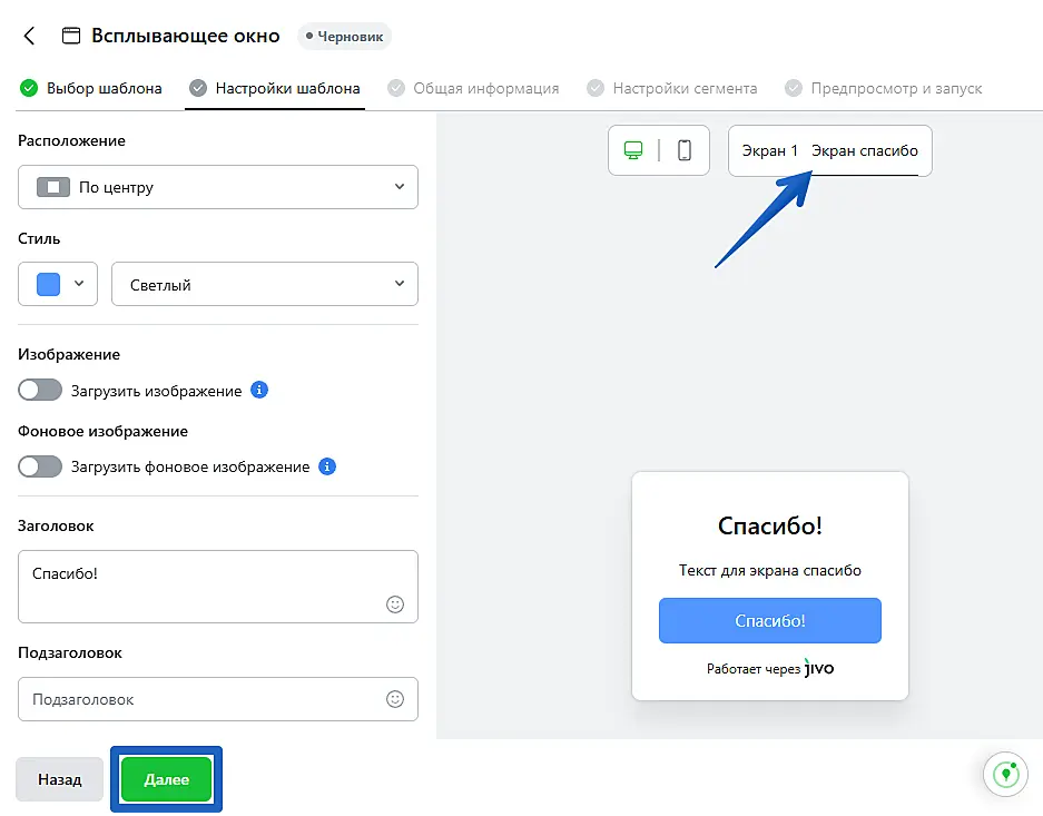 В этом же разделе вы можете настроить экран с благодарностью за прохождение опроса или указание контактов. Нажмите "Экран спасибо", настройте и заполните все необходимые поля по аналогии с полями выше.