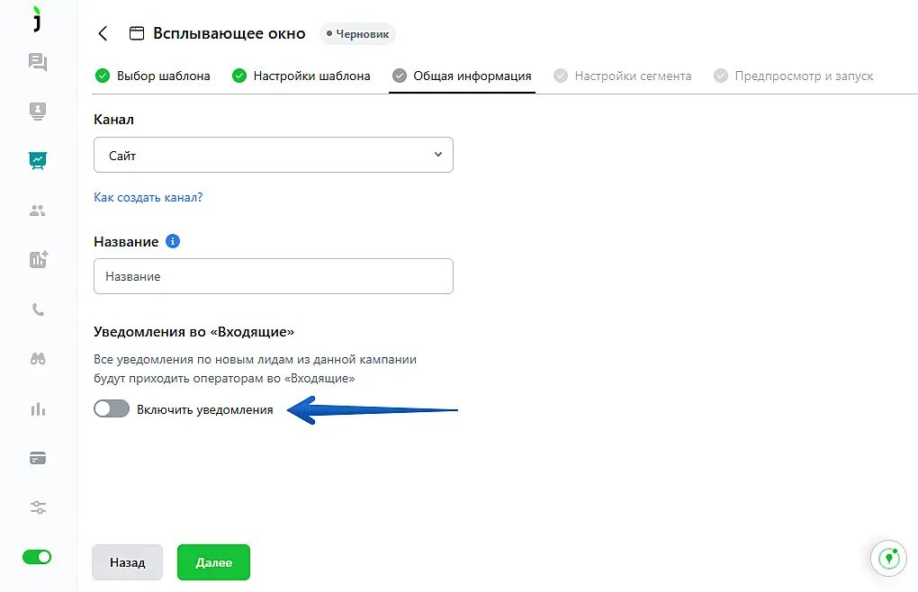На следующем шаге выберите канал связи с сайтом, на котором хотите показывать это всплывающее окно. И укажите название, его увидите только вы в разделе "Маркетинг", клиентам оно отображено не будет.