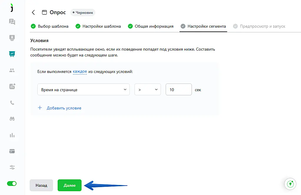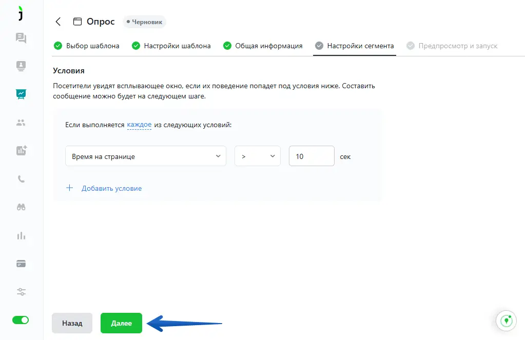 Здесь задаются условия, которые должны быть выполнены для срабатывания всплывающего окна. Прочитать о них подробнее и узнать логику их срабатывания вы можете в статье "Справочник по настройке сегмента".