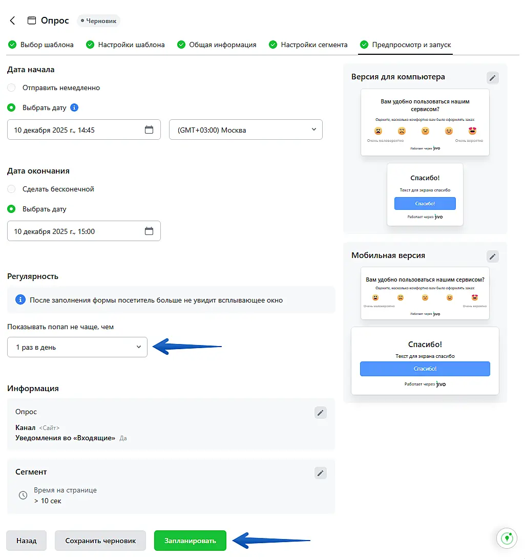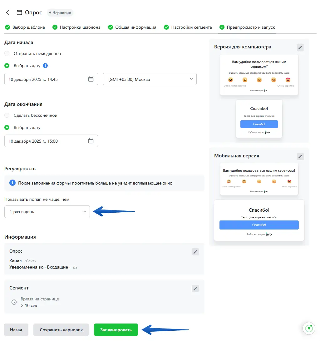 Для завершения настроек и начала показа интерактивного сообщения нажмите "Запланировать". Чтобы вернуться к настройке сообщения позднее, выберите "Сохранить черновик".