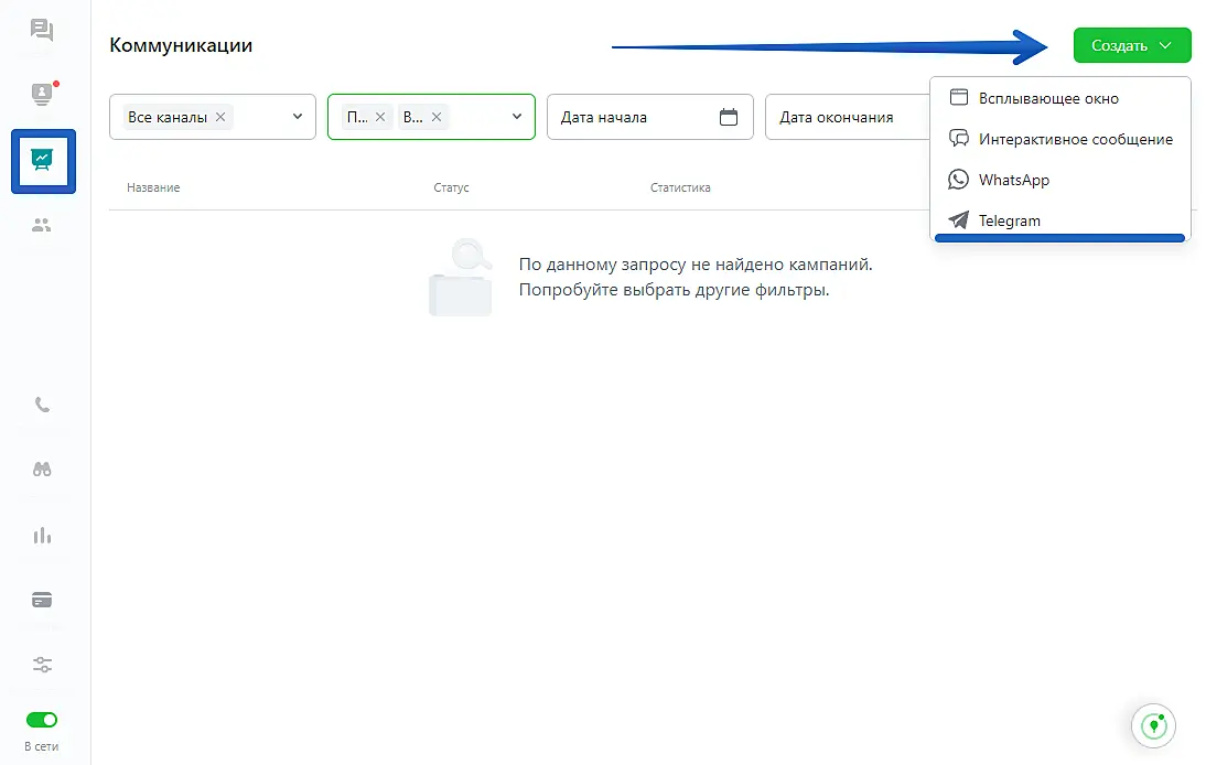 - Перейдите в раздел "Маркетинг" и нажмите кнопку "Создать" в правом верхнем углу.