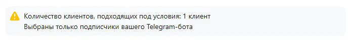Шаблон будет отправлен всем, кто подошел под условия. Когда выберете существующий фильтр или нажмете "Сохранить фильтр" для новых параметров, вам отобразится количество подходящих клиентов.