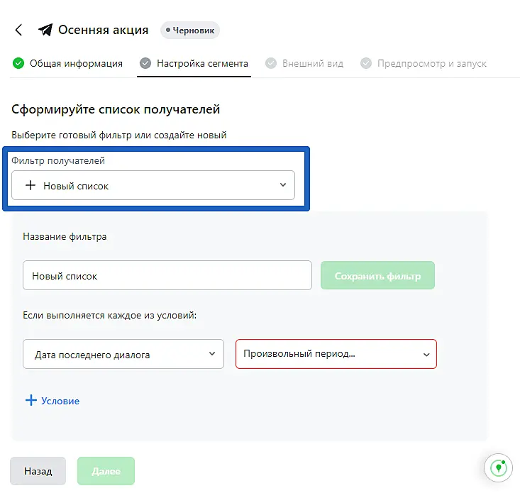 - Задайте условия формирования списка клиентов, которым будет отправлена кампания, или выберите уже существующий список, нажав на стрелочку в строке "Фильтр получателей".