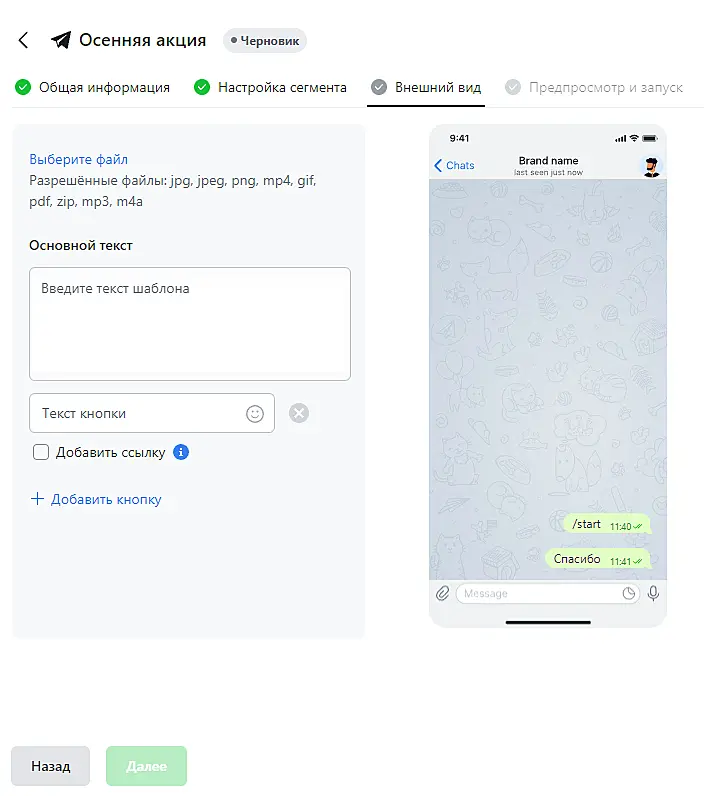 - После настройки внешнего вида нажмите "Далее". Вы перейдете к последнему шагу - "Предпросмотр и запуск".