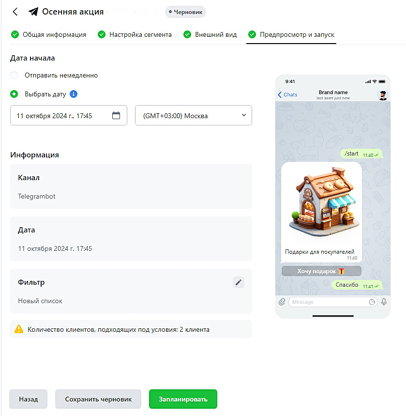 - Проверьте внешний вид сообщения, канал, из которого отправится кампания, и список клиентов. В правой части отображается окончательный вид настроенного сообщения. При необходимости можно изменить любые настройки, нажав на значок редактирования.