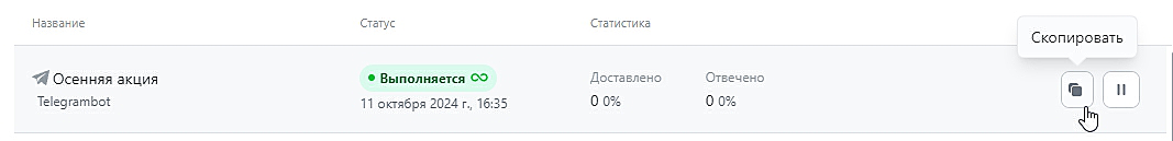 Кампанию в любом статусе можно скопировать. Наведите на строку с ее названием, чтобы появилась нужная иконка.