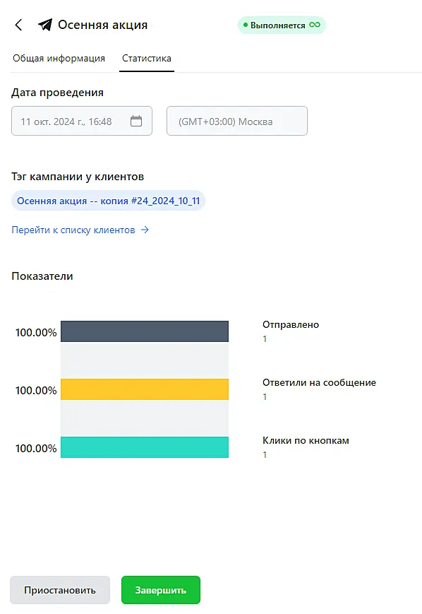 Также в этом разделе отображается тег кампании, который автоматически присваивается ответившим на нее клиентам. Нажмите "Перейти к списку клиентов", чтобы просмотреть всех клиентом с этим тегом в разделе "CRM" > "Клиенты".