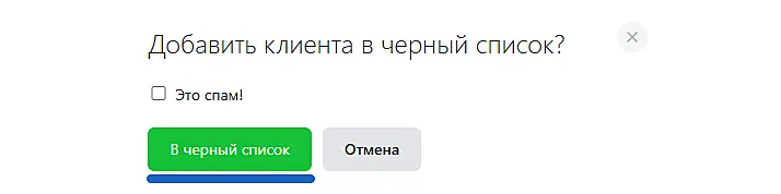 Вы можете заблокировать клиента кнопкой "В спам" в окне диалога. Кнопка находится на панели сверху: