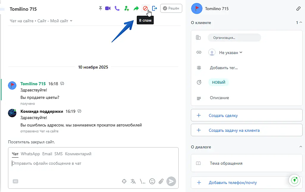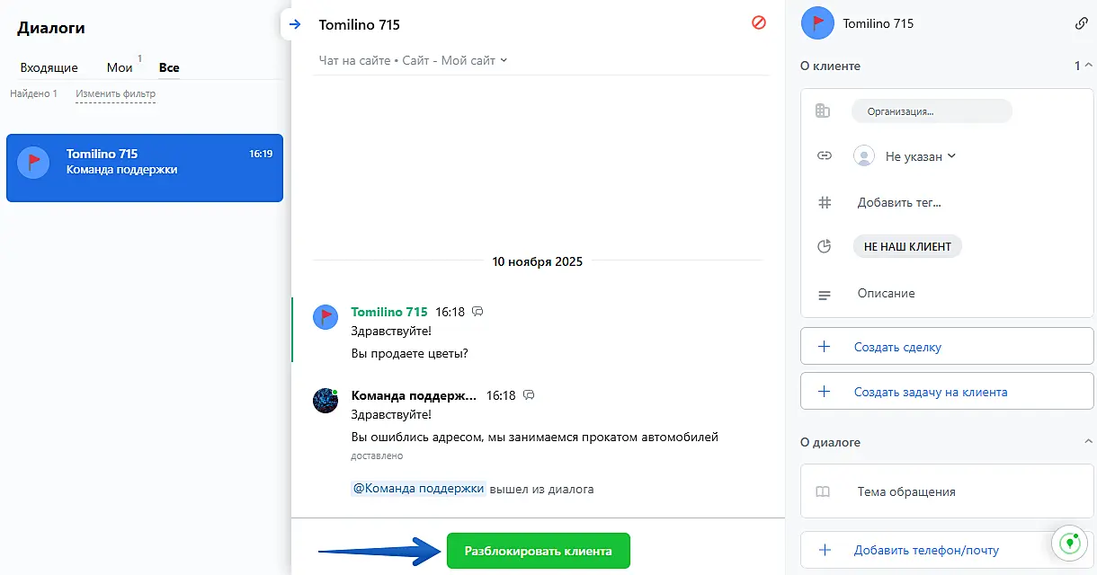 После этого окно чата пропадет для этого посетителя, и он не сможет больше вам написать. При блокировке клиенту автоматически прописывается статус "Не наш клиент".