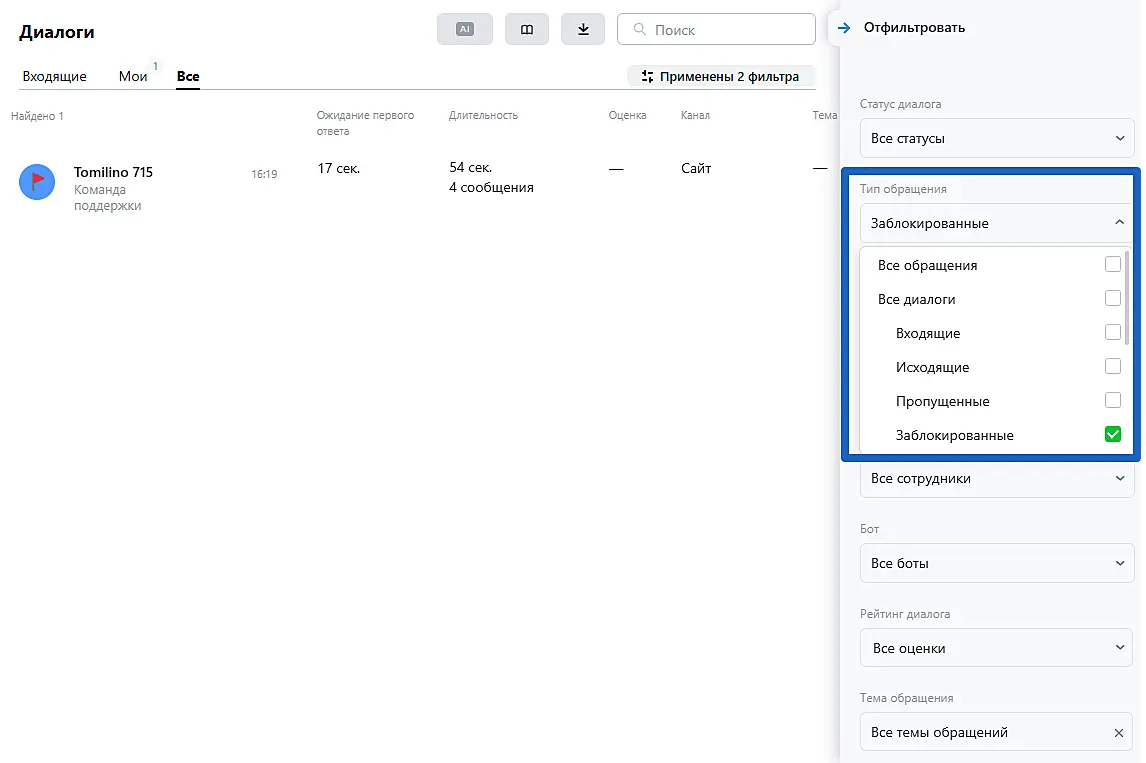 В фильтре "Тип обращения" выберите "Заблокированные". Вы увидите список заблокированных клиентов. При необходимости используйте другие фильтры.
