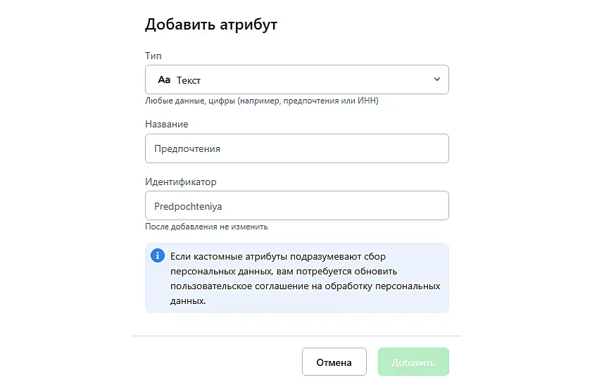 Атрибуты клиента - это дополнительные данные, которые вы можете добавить к профилям клиентов для улучшения их сегментации, персонализации и аналитики.