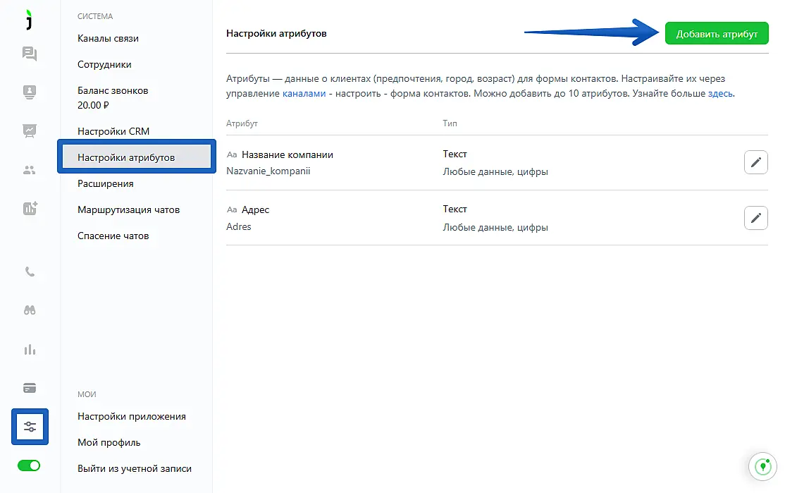 Зайдите в приложение Jivo, раздел "Управление" > "Настройки атрибутов".