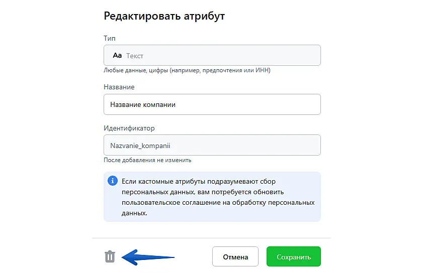 Важно: если вы удалите атрибут, удалится вся информация о пользователях, которая была по нему передана.
