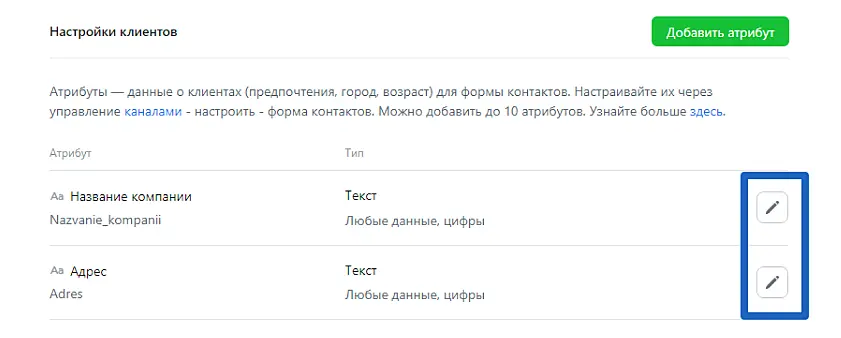 В этом же разделе вы сможете отредактировать или удалить атрибуты. Для редактирования нажмите на иконку с карандашом.