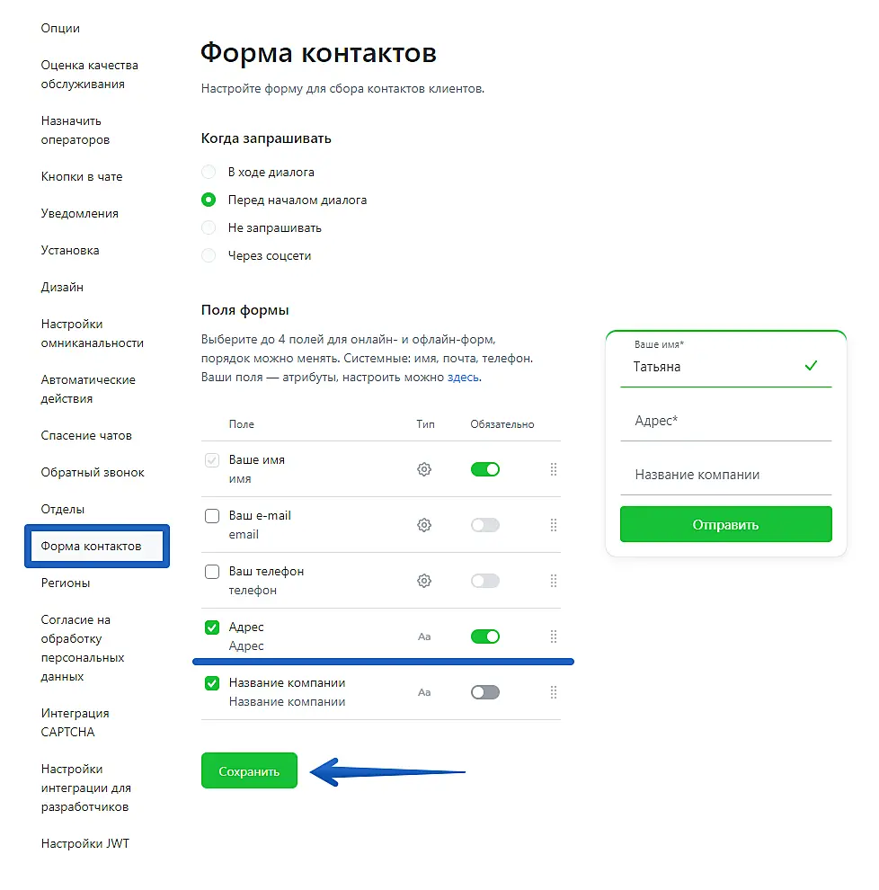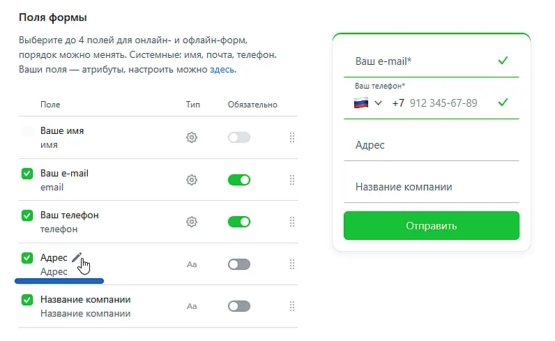 В форме контактов на сайте можно отобразить до четырех полей. Созданные атрибуты будут расположены в конце списка. Галочками отметьте необходимые.
