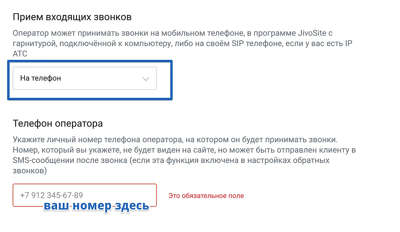 1. Если вы хотите перенаправлять звонки из Jivo на свой номер телефона, то в поле "Прием звонков" выберите пункт "На телефон" и укажите ваш номер.