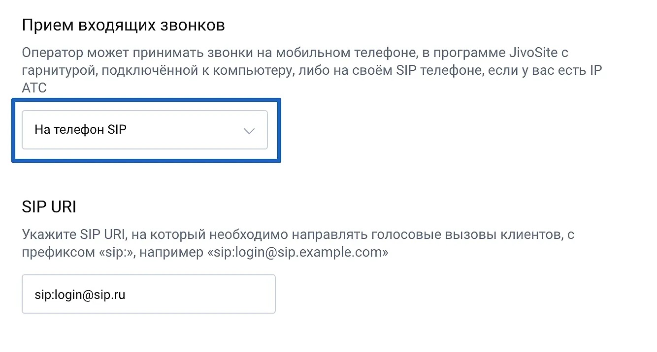 3. Если вы хотите принимать звонки на SIP-номер, то в поле "Прием звонков" выберите "На телефон SIP" и ниже укажите SIP URI (его можно посмотреть в настройках вашей учетной записи в вашей АТС). Обратите внимание, что SIP URI должен быть указан именно таким образом: sip:далее-ваш-логин-без-пробелов.