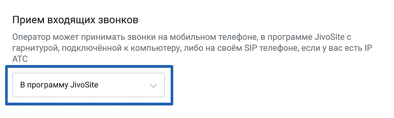 2. Вы также можете отвечать на звонки прямо в приложении Jivo на компьютере или смартфоне. Для того в поле "Прием звонков" нужно выбрать "В программу Jivo".