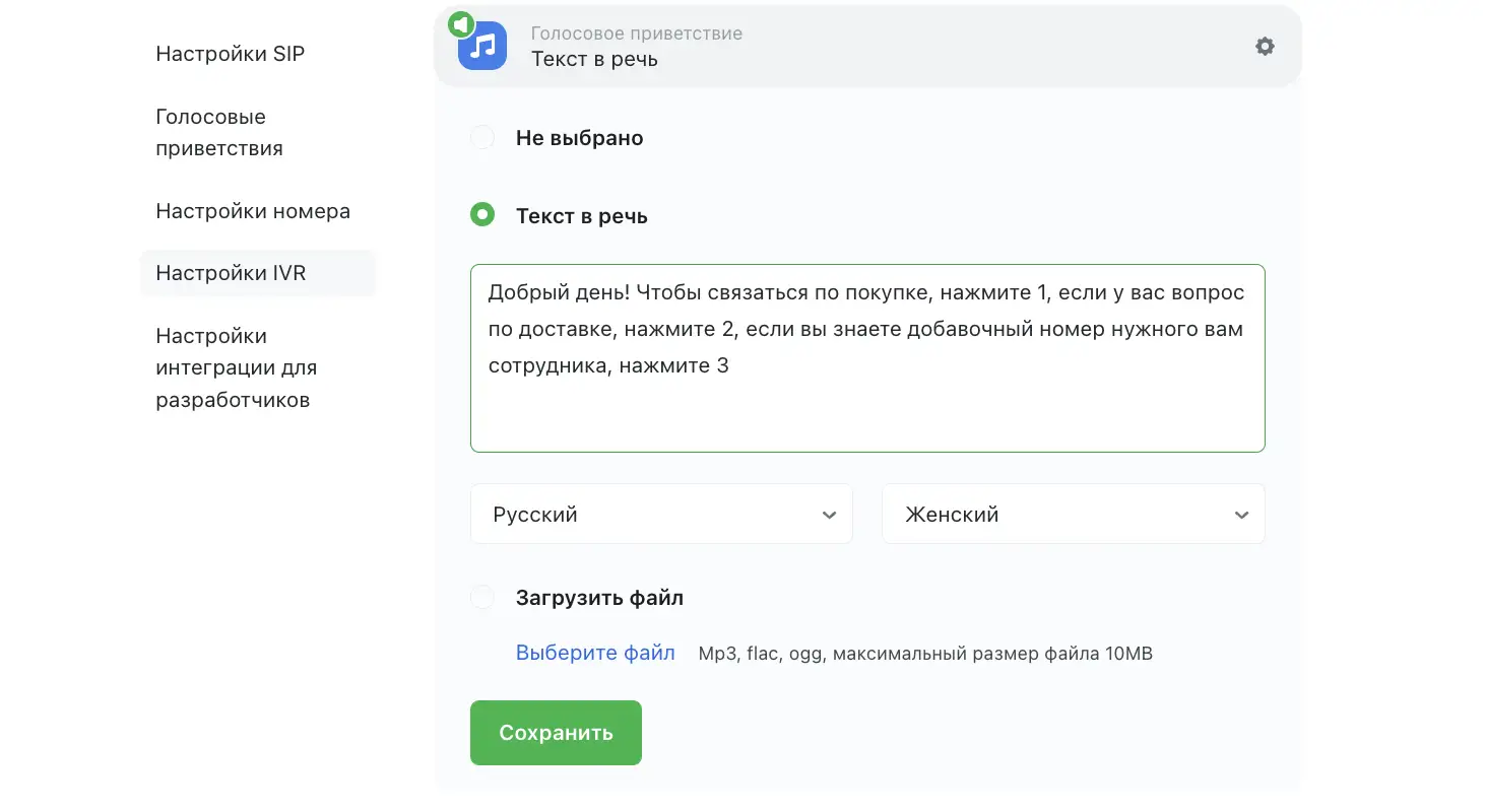 В начале алгоритма находится "Голосовое приветствие". В приветствии необходимо озвучить доступные для клиента опции, например: "Добрый день! Чтобы связаться по покупке, нажмите 1, если у вас вопрос по доставке, нажмите 2". Фразу можно написать текстом, и ее воспроизведёт робот, а можно загрузить собственный аудиофайл.