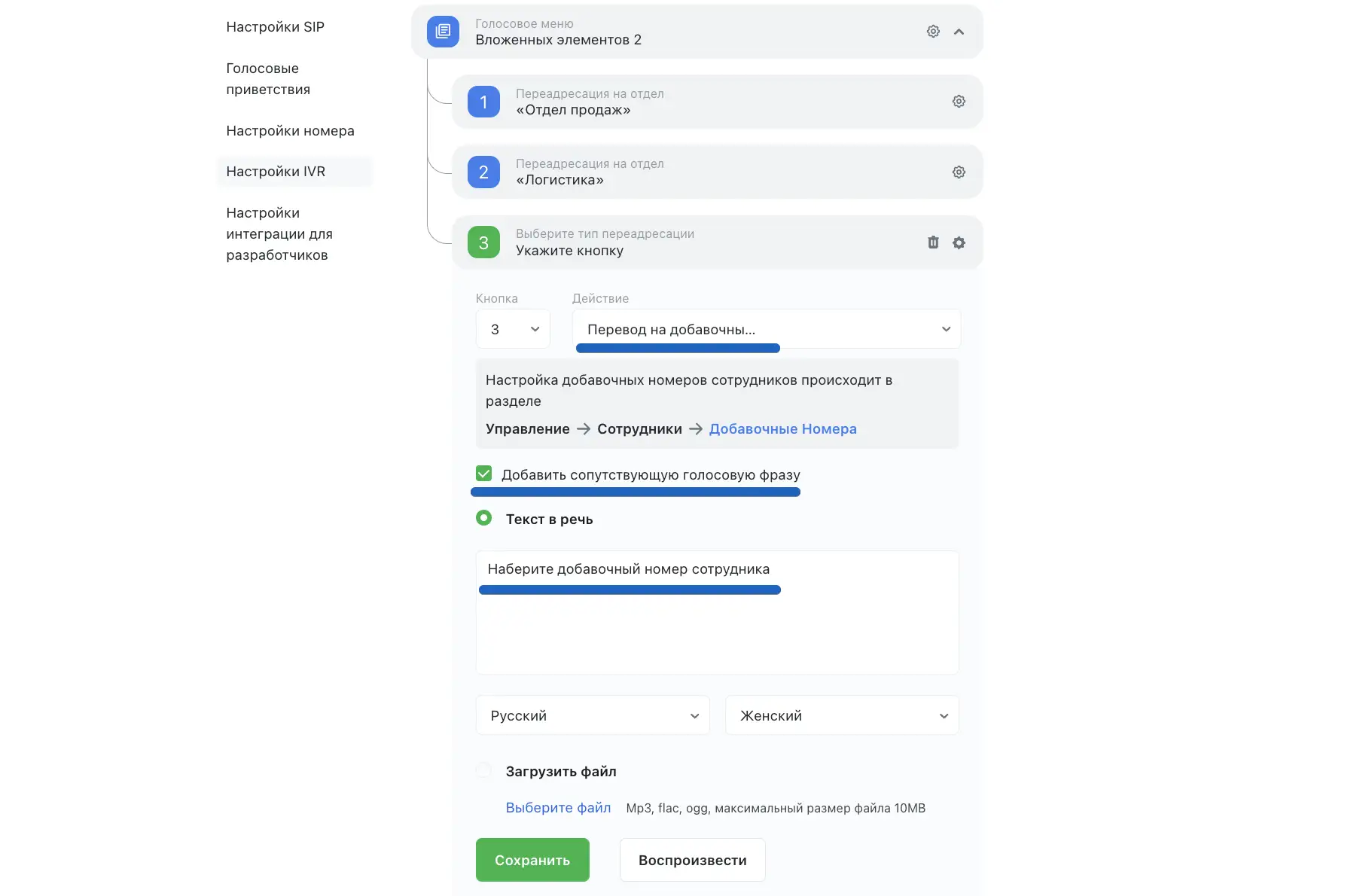 Общие принципы и настройки для перенаправления клиентов на отделы описаны в предыдущем пункте. Рассмотрим ситуацию, когда имеются два отдела, а также предлагается связаться с сотрудником, набрав его добавочный номер.