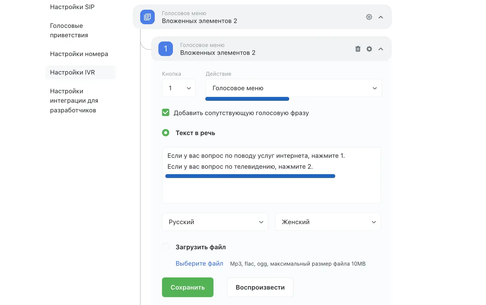 После того, как отделы созданы, можно приступить непосредственно к настройке голосового меню.